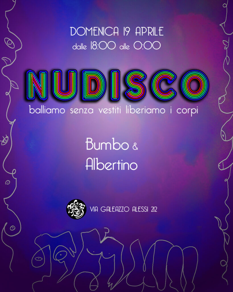 Domenica 19 Aprile 2026 NUDISCO BALLIAMO SENZA VESTITI, LIBERIAMO I CORPIBumbo & Albertino ✨ NUDISCO ✨ Domenica 19 Aprile 2026🕕 18:00 → 00:00 📍 Magma – Via Galeazzo Alessi 212, Roma 🎶 Con: Bumbo & Albertino Un pomeriggio per liberare il corpo, la mente e le energie.NUDISCO è uno spazio di espressione, ballo e connessione dove la nudità è naturale, non sessualizzata, e profondamente liberatoria. 🌈 COSA TI ASPETTA– Musica e vibrazioni condivise– Body decoration con colori, glitter e creatività– Un ambiente sicuro, accogliente e rispettoso 💫 MOODCostruiamo insieme uno spazio libero da giudizi e discriminazioni.No a: sessismo, razzismo, omofobia, transfobia, body-shaming e ogni forma di esclusione. 👗 DRESS CODENudità integrale (intimo consentito)👉 Porta con te ciabatte + vestaglia/accappatoio per gli spostamenti negli spazi. 💸 CONTRIBUTO5€ – volontar* (arriva presto o aiutaci a smontare)7€ – partecipante10€ – sostenitor* 🎟️ ACCESSOEvento riservato ai soci ARCIPuoi fare la tessera in loco oppure pre-aderire:portale.arci.it/preadesione/magma 🚪 Nessuna prenotazione necessaria→ Consigliato arrivare presto per entrare insieme nel mood della serata 💃 Liberiamoci. Balliamo. Connettiamoci. Domenica 19 Aprile, ore 18.00-00.00 Via Galeazzo Alessi 212 Orario e sede Come prenotare Per sostenere l’evento chiediamo il contributo di 10€ a persona. 📎 Per saperne di più seguite la pagina fb: @LTLT.Sex.Positive prenota